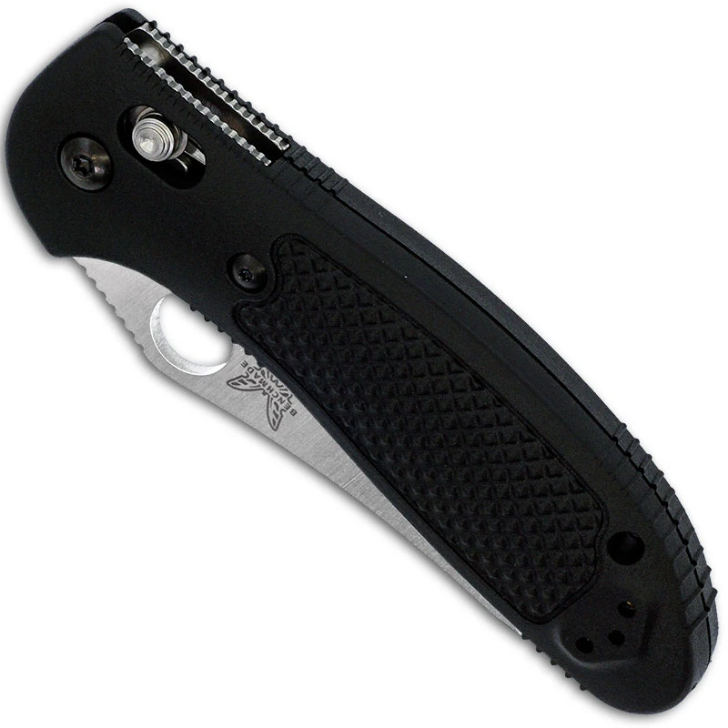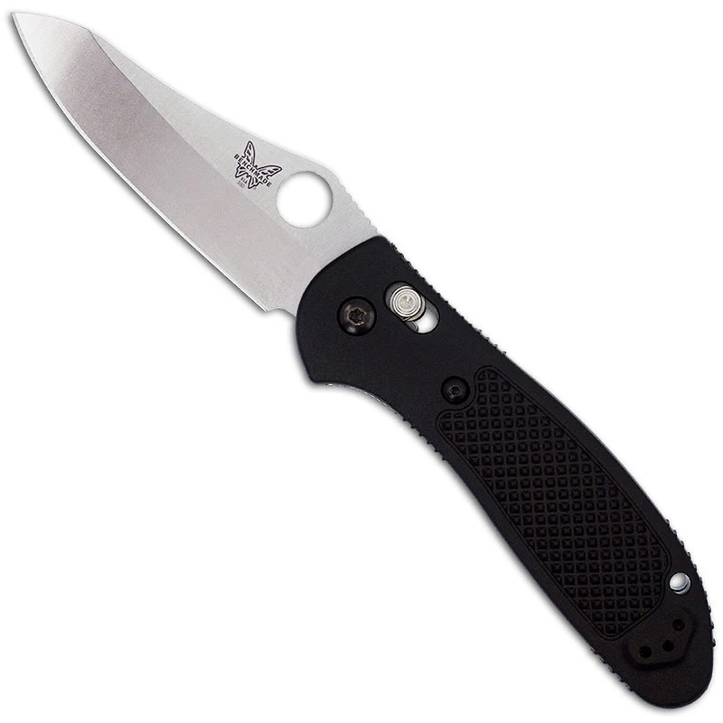 The Griptilian Series in S30V! The 550 Benchmade Griptilian is a workhorse of an EDC, designed by Mel Pardue, that features a 3.45 inch sheepfoot blade made of S30V premium stainless steel, .115 inches thick, with a notched thumb ramp for secure grip, and a hole for ambidextrous one hand opening. The black GFN (glass filled nylon) handle, 4.62 inches closed, has checkered texturing and notches for secure purchase, sturdy AXIS Lock, and a side to side reversible pocket clip mounted at the butt end. The Benchmade 550 Griptilian Knife has an overall open length of 8.07 inches, and it weighs 3.79 ounces. Proudly made in the USA.