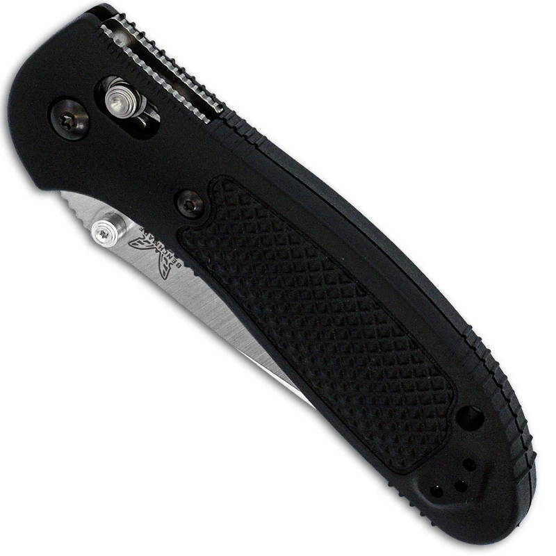 The Griptilian Series in S30V! The 551 Benchmade Griptilian is a workhorse of an EDC, designed by Mel Pardue, that features a 3.45 inch drop point blade made of CPM S30V premium stainless steel, .115 inches thick, with a notched thumb ramp for secure grip, and dual thumb studs for ambidextrous one hand opening. The black GFN (glass filled nylon) handle, 4.62 inches closed, has checkered texturing and notches for secure purchase, sturdy AXIS Lock, and a side to side reversible pocket clip mounted at the butt end. The Benchmade 551 Griptilian Knife has an overall open length of 8.07 inches, and it weighs 3.88 ounces. Proudly made in the USA.