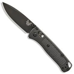 The 533BK-2 Benchmade Mini Bugout is a blackout addition to the fiendishly popular Bugout lineup that features a 2.82 inch drop point blade made of CPM S30V stainless steel, .090 inch thick, with a Rockwell hardness of 58-60. The blade has a non reflective black finish, a top swedge to lessen weight and dual thumb studs for ambidextrous one hand opening. The black CF-Elite handle, 3.70 inches closed, has checkered texturing for secure grip, AXIS Lock, a large lanyard hole, and a side to side reversible deep carry mini clip mounted at the butt end. This Benchmade Mini Bugout has an overall open length of 6.49 inches, and it weighs 1.50 ounces. Proudly made in the USA.