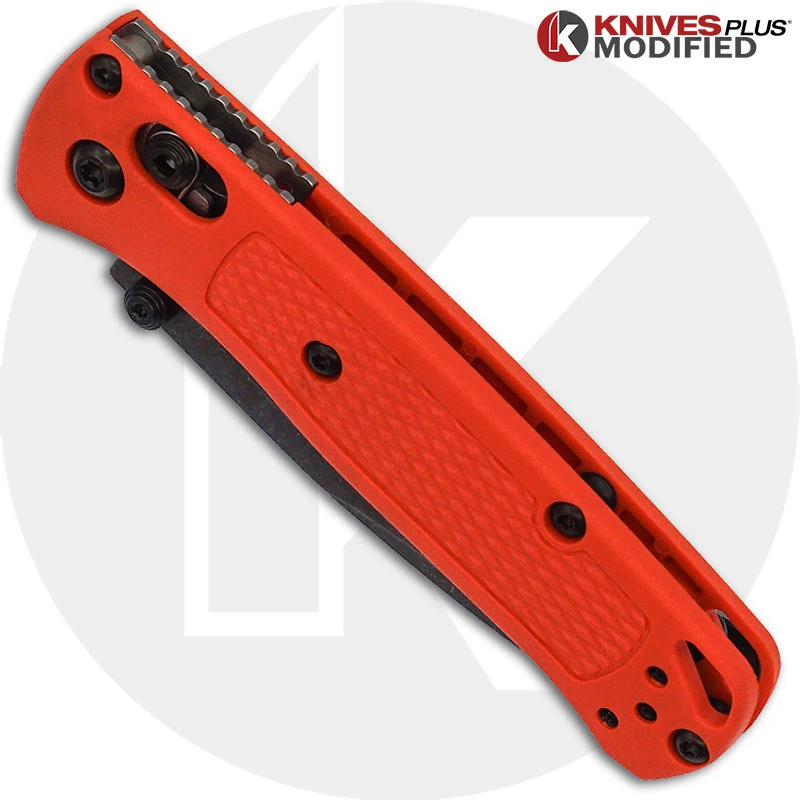 The MODIFIED 533 Benchmade Mini Bugout is a scaled down version of the fiendishly popular Bugout EDC that features an acid stonewashed 2.82 inch drop point blade made of CPM S30V stainless steel, .09 inch thick, with a Rockwell hardness of 58-60. The blade has an acid stonewashed finish, a top swedge to lessen weight and dual orange thumb studs for ambidextrous one hand opening. The slim orange Grivory handle, 3.70 inches closed, has checkered texturing for secure grip, sturdy AXIS Lock, a lanyard hole and a side to side reversible deep carry mini clip mounted at the butt end. We have replaced the orange aluminum thumbstud and standoffs with our KP Produced Black Stainless Steel Thumbstud and Standoffs. The MODIFIED Benchmade Mini Bugout has an overall open length of 6.49 inches, and it weighs 1.5 ounces. Proudly made in the USA.