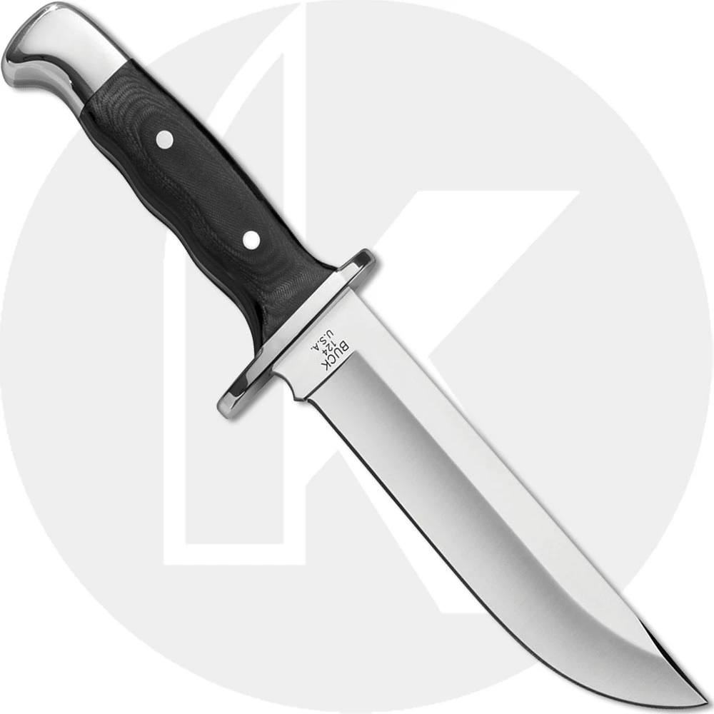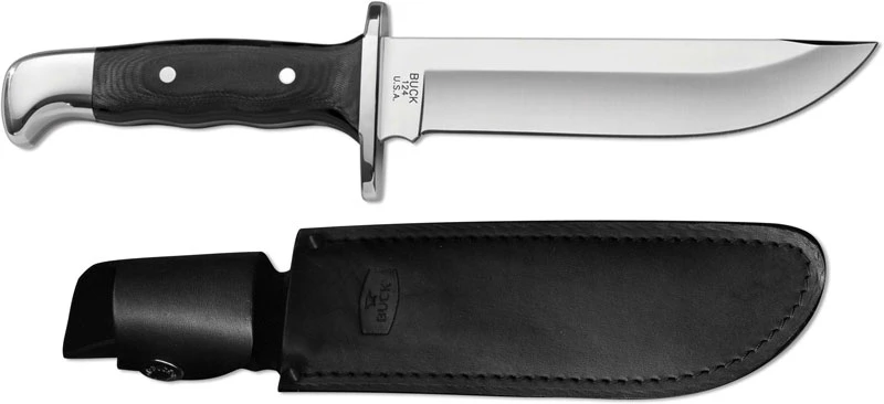 The illustrated Buck knife is the Buck Frontiersman Knife that features a 6 1/4″ fixed blade made of satin finished 420HC stainless steel. This Buck Knife has full tang construction for strength, black Micarta scales, an aluminum cross guard and an aluminum pommel. A black genuine leather sheath is included with this Buck Knife. The Buck Frontiersman Knife with black Micarta handle has an overall length of 11 3/4″, and it weighs 13.3 ounces. Made in the USA.