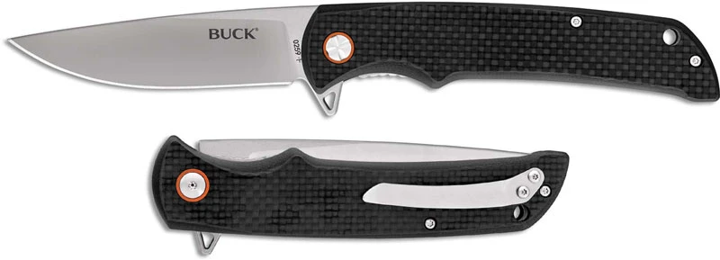The 0259CFS Buck Haxby Knife is an eyecatching value priced EDC that features a 3 7/8 inch drop point blade made of 7Cr stainless steel with a satin finish and a flipper for ambidextrous one hand opening. The slim profile black carbon fiber handle, 5 inches closed, has a ball bearing pivot for smooth action, red pivot ring detail for visual interest, ergonomic contours for comfort, steel liners for strength, sturdy liner lock, a lanyard hole and a removable stainless steel pocket clip mounted at the butt end. The Buck Haxby Knife has an overall open length of 8 7/8 inches, and it weighs 4.5 ounces. Made in China.