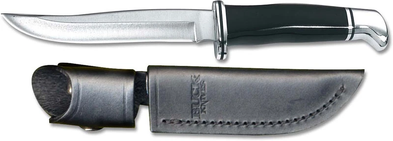 The illustrated Buck knife is the Buck Pathfinder Knife that features a 5″ modified clip point blade made of 420HC stainless steel, .120 inches thick. The black Phenolic handle of this Buck Knife has an aluminum guard and a curved aluminum pommel for secure grip. A black genuine leather sheath is included with this Buck knife. The Buck Pathfinder Knife has an overall length of 9 1/8″, and it weighs 4.5 ounces. Made in the USA.