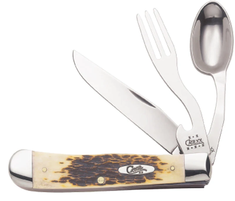 The illustrated Case Knife is the Amber Bone (6354HBSS) Case Hobo Knife that features a clip blade, a fork and a spoon made of Tru-Sharp surgical stainless steel. The Peachseed Jigged Amber Bone handle of this Case knife, 4 1/8″ closed, has a nickel silver Case shield and nickel silver bolsters. The Case Hobo Knife with Amber Bone handle weighs 7.7 ounces. Made in the USA.