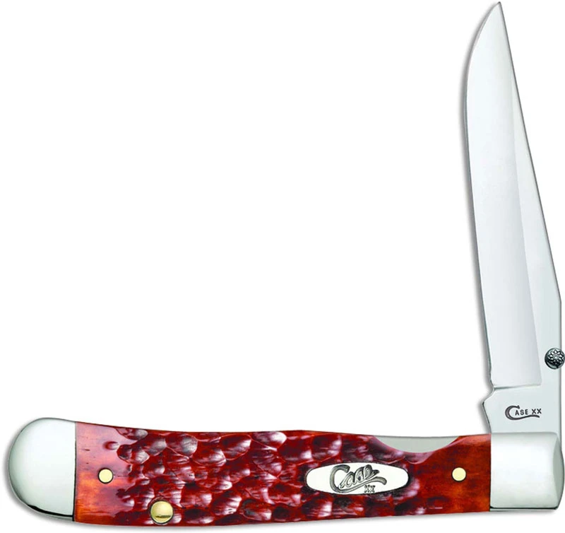 The 07004 Case Chestnut Bone CV (6154ACCV) Kickstart TrapperLock Knife features a locking clip blade made of chrome vanadium steel with a thumb stud and Assist for one hand opening. The Standard Jig Chestnut Bone handle of this Case knife, 4 1/8 inches closed, has the Case Oval Script shield, nickel silver bolsters, a liner lock and a pocket clip mounted at the pivot end. The Case Kickstart TrapperLock Knife weighs 3.6 ounces. Made in the USA.