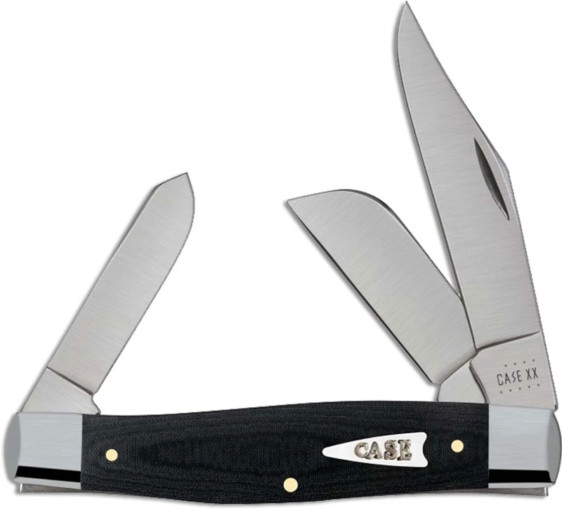 The 27732 Case Black Micarta (10375SS) Large Stockman Knife features clip, spey and sheepfoot blades made of satin finished Tru-Sharp Surgical steel with nail nicks for opening. The Smooth Black Micarta handle, 4 1/4 inches closed, has the Case Arrowhead Shield and satin finished nickel silver bolsters. The Case Large Stockman Knife weighs 4.1 ounces. Made in the USA.