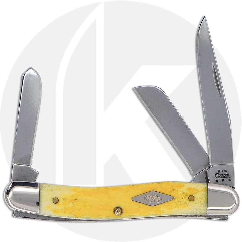 The 07034 Case Tradewinds Collection (6318 SS) Medium Stockman Knife features clip, sheepfoot and spey blades made of mirror polished Tru-Sharp Surgical steel with nail nicks for opening. The Standard Jig Rainforest Yellow Bone handle, 3 5/8 inches closed, has the Case Diamond Shield and nickel silver bolsters. The Case Medium Stockman Knife weighs 2.5 ounces. Discontinued item, BNIB; limited run of 500 pieces, made in the USA in 2004.