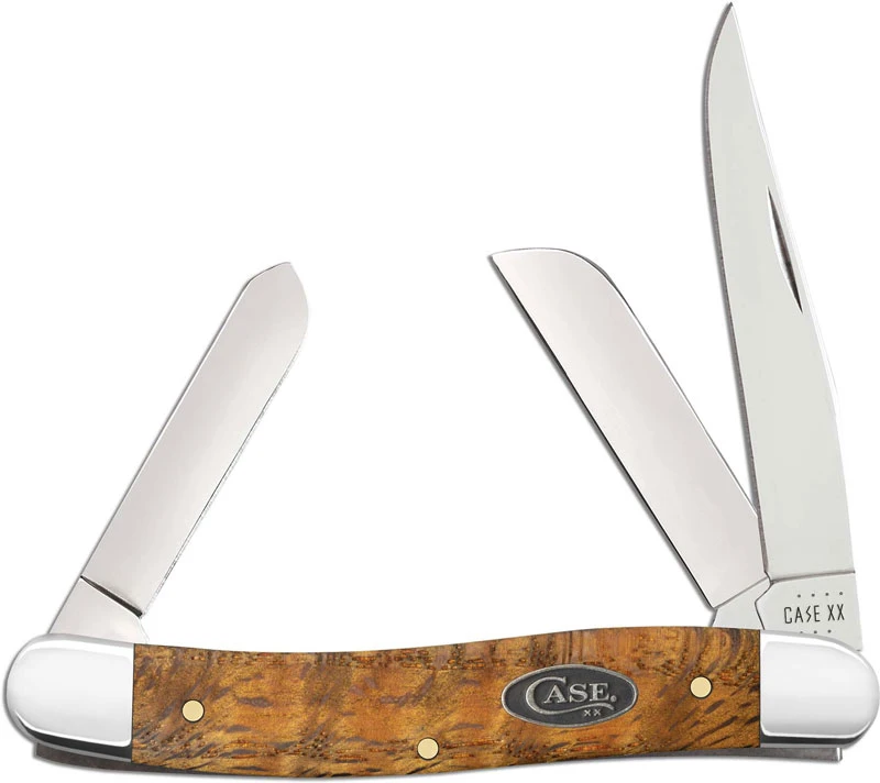 The 47122 Case Yellow Curly Oak (7318SS) Medium Stockman Knife features clip, sheepfoot and spey blades made of Tru-Sharp surgical stainless steel with nail nicks for opening. The beautiful Yellow Curly Oak handle, 3 5/8 inches closed, has the Case Pewter Shield and nickel silver bolsters. The Case Medium Stockman Knife weighs 2.5 ounces. Made in the USA.