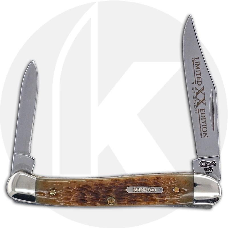 The 03972 Case Limited Edition III (62109XSS) Mini Copperhead Knife features a clip blade with Limited XX Edition embellishment and a pen blade made of mirror polished Tru-Sharp Surgical steel, with nail nicks for opening. The Rogers Jig Butternut Bone handle, 3 1/8 inches closed, has a Case XX Bar Shield and nickel silver bolsters. The Case Mini Copperhead Knife weighs 1.4 ounces. Discontinued item, limited to 2500 pieces, BNIB; made in the USA.