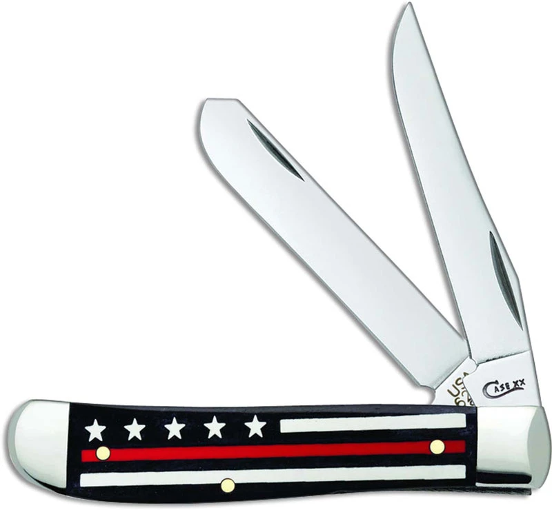 The Case Stripes of Service Series of knives is a tribute to first responders everywhere. The 07311 Case Stars of Service (6207SS) Mini Trapper Knife features clip and spey blades made of Tru-Sharp Surgical steel with nail nicks for opening. The Smooth Natural Bone handle of this Case knife, 3 1/2 inches closed, has Black, White and Red Line color wash embellishment and nickel silver bolsters. The Case Mini Trapper Knife weighs 2.7 ounces. Made in the USA.