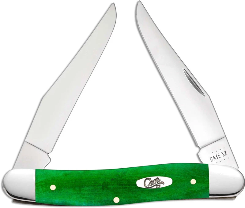 The 52822 Case Brilliant Green Bone (MUSKRATSS) Muskrat Knife features two mirror polished clip blades made of Tru-Sharp Surgical Steel with nail nicks for opening. The smooth Brilliant Green Bone handle, 3 7/8 inches closed, has the Case Oval Script Shield and nickel silver bolsters. The Case Muskrat Knife weighs 2.6 ounces. Made in the USA.