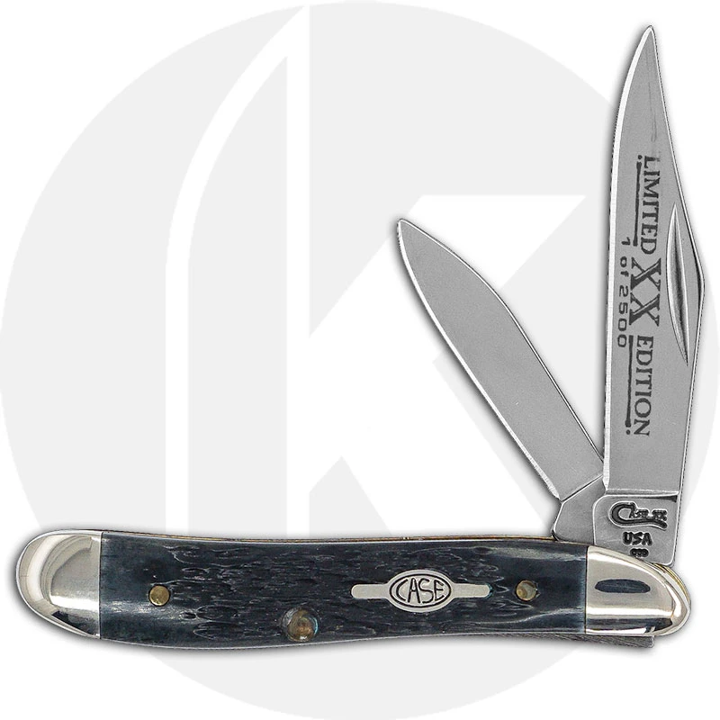 The 04970 Case Limited Edition IV (6220SS) Peanut Knife features a clip blade with Limited XX Edition embellishment and a pen blade made of mirror polished Tru-Sharp Surgical steel, with nail nicks for opening. The Rogers Jig Pitch Black Bone handle, 2 7/8 inches closed, has a Case Saturn Shield and nickel silver bolsters. The Case Peanut Knife weighs 1.2 ounces. Discontinued item, limited to 2500 pieces, BNIB; made in the USA.