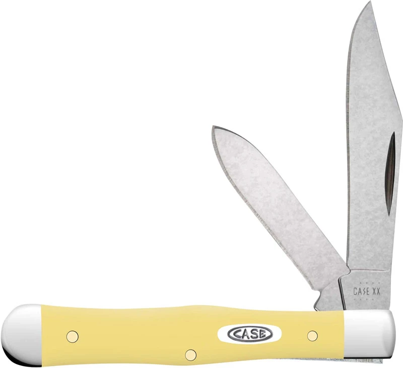 The 81097 Case Smooth Yellow Synthetic (3225 1/2SS) Small Swell Center Jack Knife features clip and pen blades made of Tru-Sharp Surgical Steel with nail nicks for opening. The Smooth Yellow Synthetic handle, 3 inches closed, has the Case Oval Shield and nickel silver bolsters. The Case Small Swell Center Jack Knife weighs 1.7 ounces. Made in the USA.