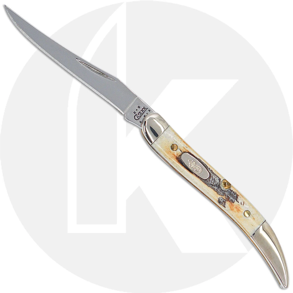 The 03575 Case 6.5 BoneStag (6.510096SS) Small Texas Toothpick Knife features a mirror polished long clip blade made of Tru-Sharp Surgical Steel with a nail nick for opening. The jigged BoneStag handle, 3 inches closed, has the Case Oval Script Shield and nickel silver bolsters. The Case Small Texas Toothpick Knife weighs 1 ounce. Discontinued item, BNIB; made in the USA in 2003.