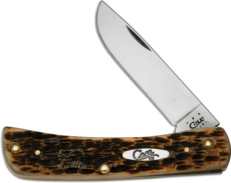 The illustrated Case Knife is the Amber Bone (6137SS) Case Sod Buster Jr Knife that features a sod buster skinner blade made of stainless steel with a nail nick for opening. The Peach Seed Jigged Amber Bone handle of this Case knife, 3 5/8″ closed, has brass liners and a nickel silver Case shield. The Case Sod Buster Jr Knife with Amber Bone handle weighs 2.2 ounces. Made in the USA.
