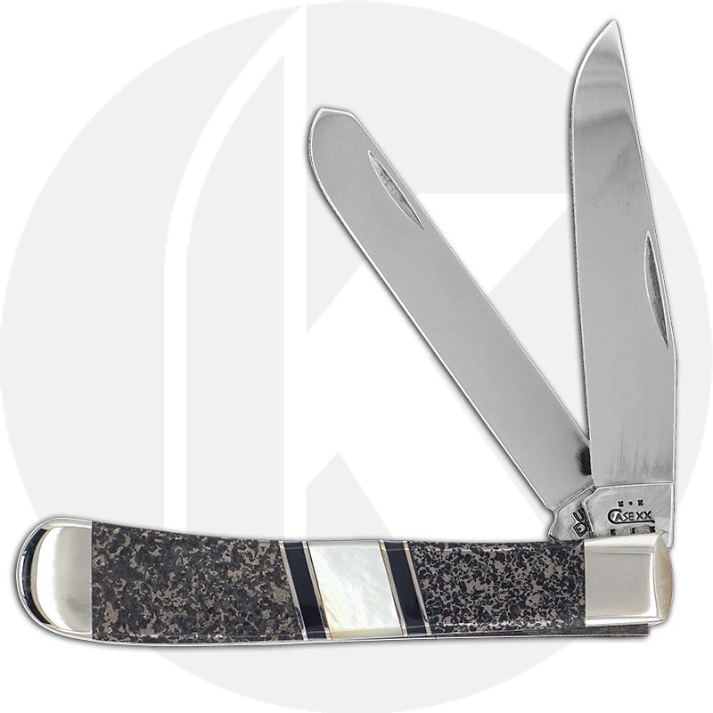 The 06400 Case Exotic Apache Gold (EX254SS) Trapper Knife features clip and spey blades made of mirror polished Tru-Sharp Surgical steel with nail nicks for opening. The eye catching Apache Gold handle, 4 1/8 inches closed, has Gold Mother of Pearl, black stone and nickel silver inlays, and nickel silver bolsters. The Case Trapper Knife weighs 4.0 ounces. Discontinued item, BNIB; made in the USA in 2004.