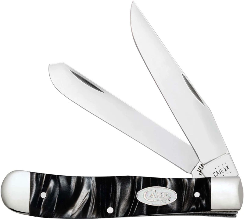 The 23670 Case Black Pearl Kirinite (10254SS) Trapper Knife features clip and spey blades made of mirror polished Tru-Sharp Surgical steel with nail nicks for opening. The Black Pearl Kirinite handle, 4 1/8 inches closed, has the White SparXX Case Shield and nickel silver bolsters. The Case Trapper Knife weighs 4.0 ounces. Made in the USA.