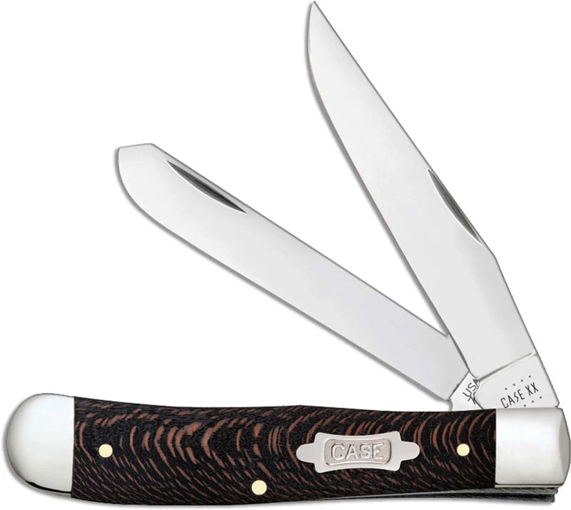 The 25570 Case Black Sycamore Wood (7254SS) Trapper Knife features clip and spey blades made of mirror polished Tru-Sharp Surgical Steel with nail nicks for opening. The genuine Black Sycamore Wood handle, 4 1/8 inches closed, has the Case Bowtie shield and nickel silver bolsters. The Case Trapper Knife weighs 4.0 ounces. Made in the USA.