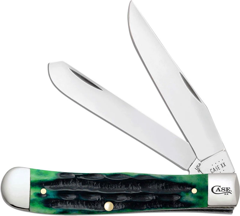 The 75830 Case Hunter Green Bone (6254SS) Trapper Knife features clip and spey blades made of Tru-Sharp surgical stainless steel with nail nicks for opening. The Deep Canyon Jig Hunter Green Bone handle, 4 1/8 inches closed, has nickel silver bolsters (one with Case Long Tail C embellishment). The Case Trapper Knife weighs 4.0 ounces. Made in the USA.