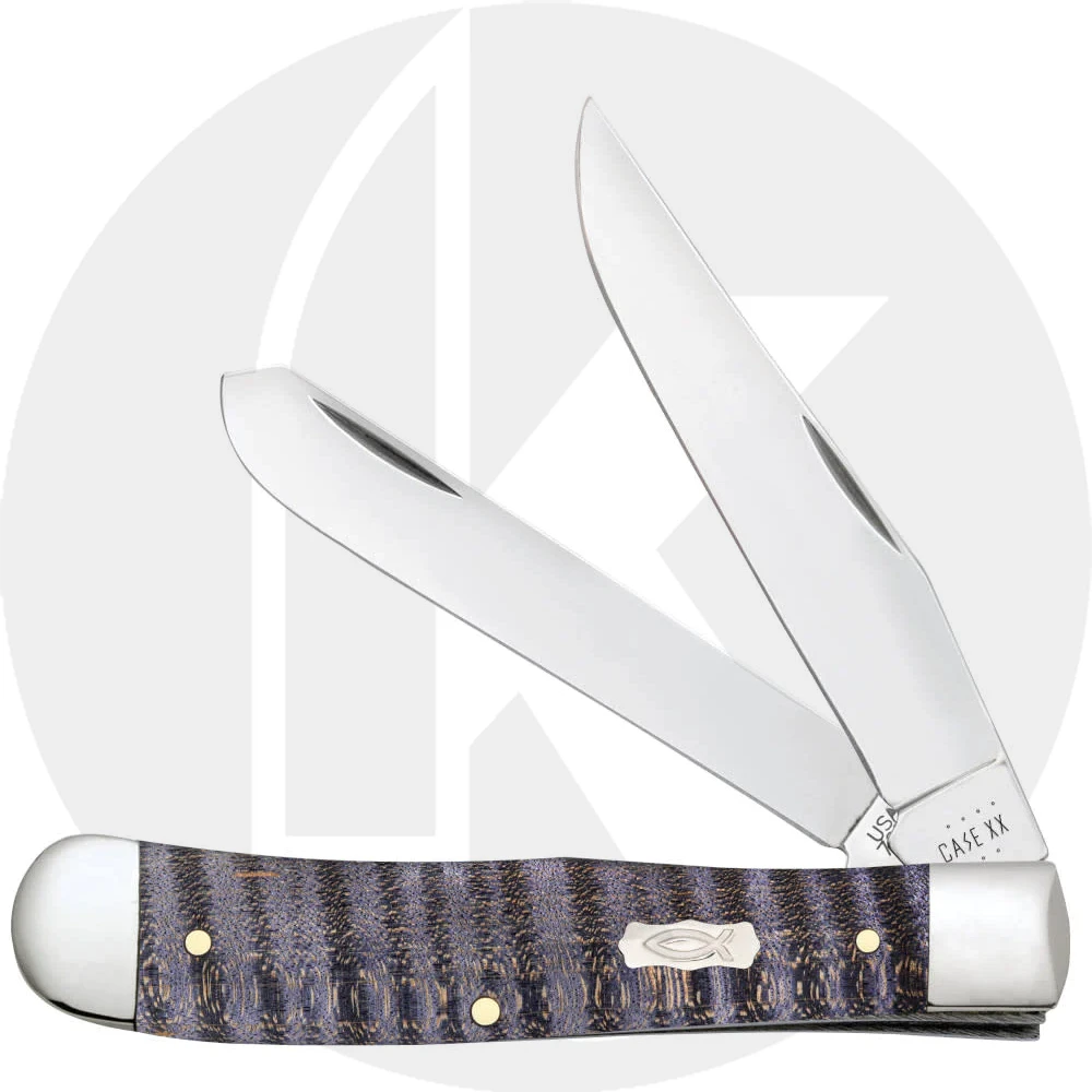 The 80540 Case Purple Curly Maple (7254SS) Trapper Knife features mirror polished clip and spey blades made of Tru-Sharp Surgical Steel with nail nicks for opening. The genuine Purple Curly Maple Wood handle, 4 1/8 inches closed, has the Ichthus Shield and nickel silver bolsters. The Case Trapper Knife weighs 4.0 ounces. Made in the USA.