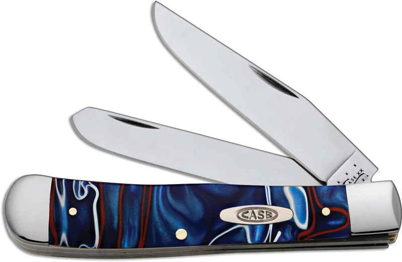 The illustrated Case Knife is the Kirinite Patriot (10254SS) Case Trapper Knife that features clip and spey blades made of Tru-Sharp surgical stainless steel with nail nicks for opening. The red, white and blue Kirinite Patriot handle of this Case knife, 4 1/8″ closed, has a nickel silver oval Case Shield and nickel silver bolsters. The Case Trapper Knife with Kirinite Patriot handle weighs 4 ounces. Made in the USA.