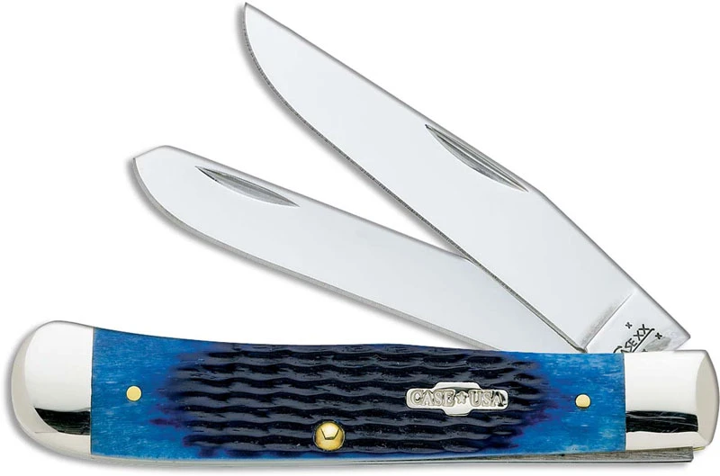 The illustrated Case Knife is the Navy Blue Bone (6254SS) Case Trapper Knife that features clip and spey blades made of Tru-Sharp surgical steel. The Rogers Corn Cob Jigged Navy Blue Bone handle of this Case knife, 4 1/8″ closed, has a nickel silver shield and nickel silver bolsters. The Case Trapper Knife with Navy Blue Bone handle weighs 4 ounces.